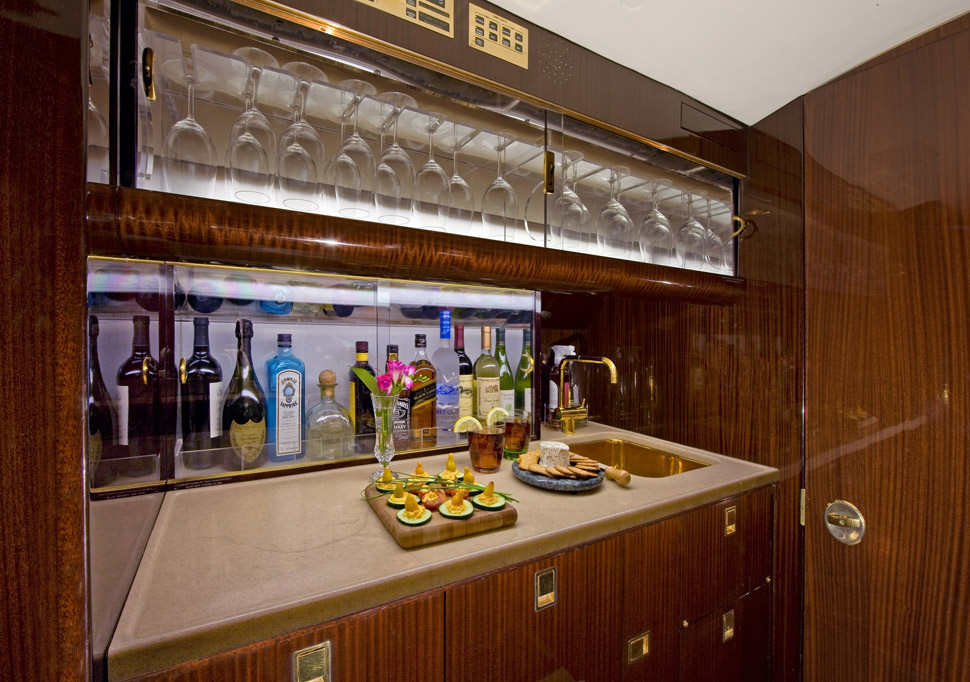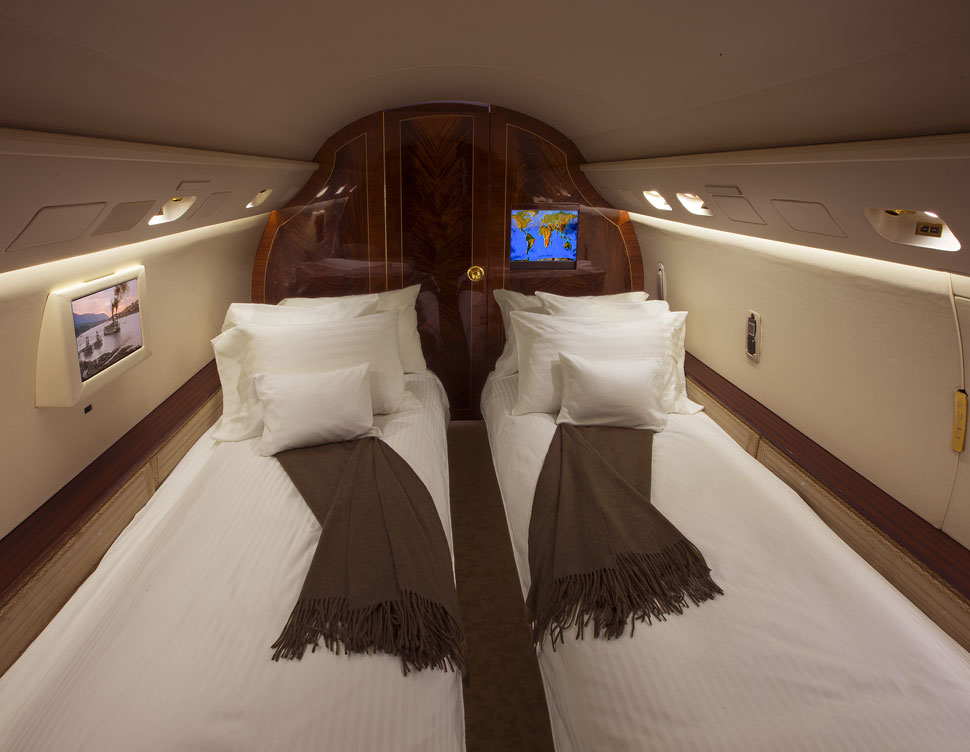 The cabin’s oversized chairs and divans convert into berthable sleepers for up to 6 passengers and are perfect for long transoceanic flights. A distinguishing feature of this world-class aircraft is that the aft section of the cabin can be secluded from the rest of the cabin and made into a private state-room with full sized bed and private aft lavatory and dressing room.