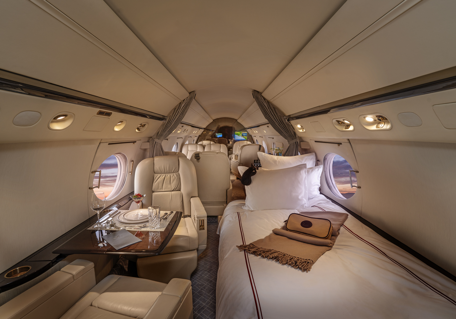 The cabin’s oversized chairs and divans convert into berthable sleepers for up to 6 passengers and are perfect for long transoceanic flights. A distinguishing feature of this world-class aircraft is that the aft section of the cabin can be secluded from the rest of the cabin and made into a private state-room with full sized bed and private aft lavatory and dressing room.